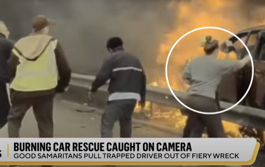 Τα πλάνα δείχνουν ανθρώπους να προσπαθούν απεγνωσμένα να ανοίξουν τις πόρτες του οχήματος πριν κάποιος σπάσει το παράθυρο του οδηγού για να μεταφέρει τον άνδρα σε ασφαλές σημείο.