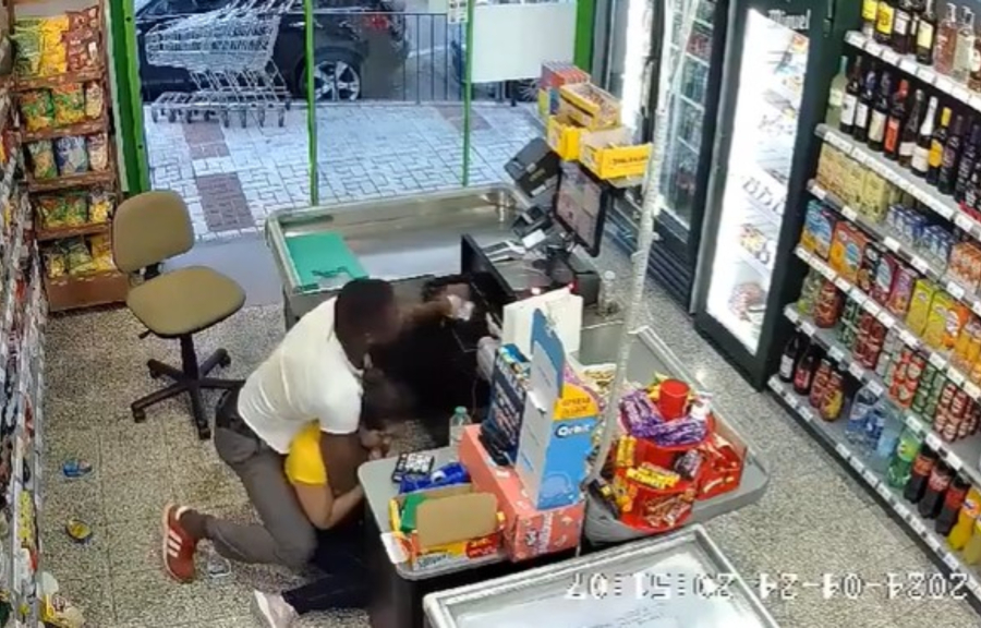 Όπως φαίνεται στο βίντεο, ο 40χρονος ληστής με καταγωγή από το Καμερούν μπήκε στο κατάστημα, άρπαξε την ανυποψίαστη Παραγουανή ταμία και της έκανε κεφαλοκλείδωμα για να κλέψει χρήματα από το ταμείο.