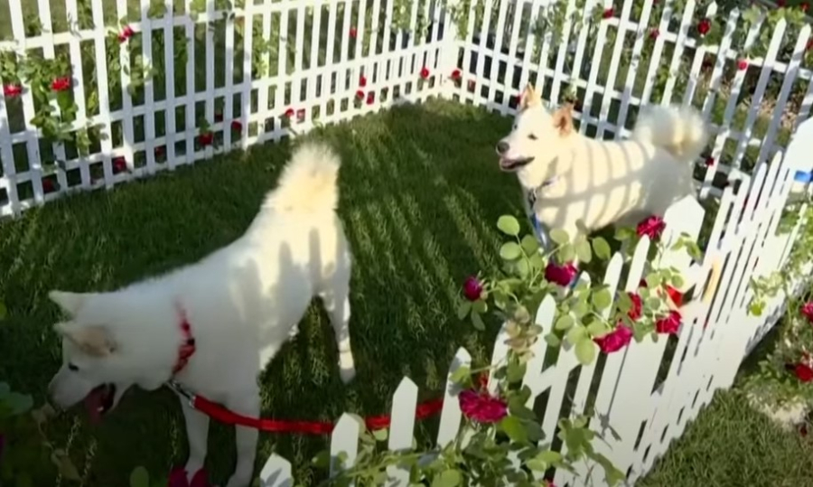 Οι Κιμ και Πούτιν φαίνονται να κοιτάζουν τους δύο σκύλους, οι οποίοι είναι δεμένοι σ' ένα φράκτη καλυμμένο με τριαντάφυλλα, σε εικόνες που προβλήθηκαν σήμερα από την ελεγχόμενη από το κράτος Κορεατική Κεντρική Τηλεόραση.
