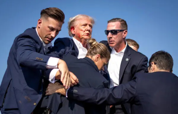 Τα μέλη της Μυστικής Υπηρεσίας στήνουν τον Τραμπ στα πόδια του. Το κόκκινο καπελάκι με το σύνθημα «Make America Great Again» του έχει πέσει, τρέχει αίμα από το αφτί του και έχει ματώσει το πρόσωπό του.