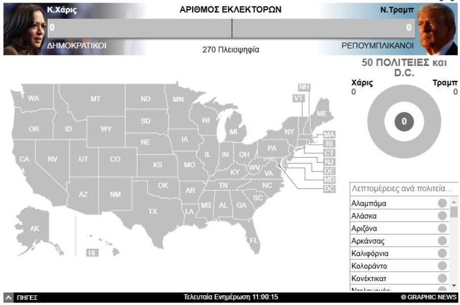 LIVE τα αποτελέσματα των Αμερικανικών Εκλογών στους αναλυτικούς χάρτες του Dnews.gr. Παρακολουθήστε λεπτό προς λεπτό με άμεση ενημέρωση όλα τα αποτελέσματα που κρίνουν το μέλλον για Ντόναλντ Τραμπ και Κάμαλα Χάρις. Οι κάλπες κλείνουν και όλα τα αποτελέσματα τρέχουν λεπτό προς λεπτό μέσα από το Dnews.gr.
