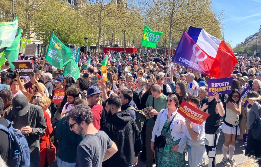 Στη συγκέντρωση των κομμάτων της αριστεράς οι διοργανωτές ανακοίνωσαν ότι έλαβαν μέρος περίπου 15.000 άτομα. Τα συνθήματα που κυριάρχησαν ήταν κατά της ακροδεξιάς με την Γραμματέα των οικολόγων Μαρίν Τοντελιέ να κατηγορεί την Λεπέν ότι επιθυμεί «ένα δικαστικό σύστημα δύο ταχυτήτων το οποίο να είναι χαλαρό απέναντι στο κόμμα της και σκληρό απέναντι στα άλλα κόμματα», ενώ ο βουλευτής της Ανυπότακτης Γαλλίας Ερικ Κοκρέλ υπογράμμισε ότι η Μαρίν Λεπέν βαδίζει στα χνάρια του Ντόναλντ Τραμπ.