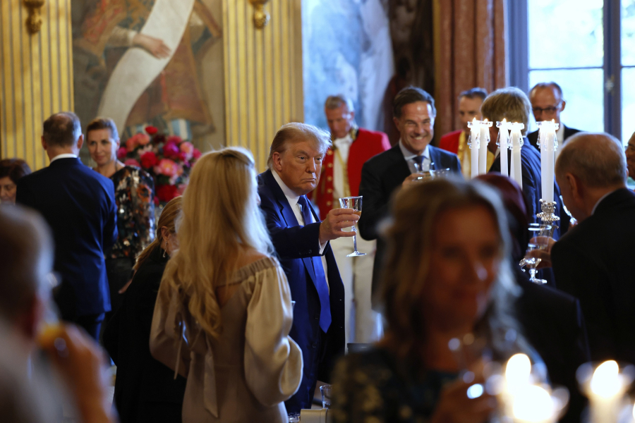 Καλεσμένοι του βασιλιά Βίλεμ- Αλέξανδρου της Ολλανδίας, ο Ντόναλαντ Τραμπ, η Τζόρτζια Μελόνι – που κάθισε δίπλα του στη ροτόντα - ο Εμανουέλ Μακρόν (λίγο πιο μακριά), ο Ρετζέπ Ταγίπ Ερντογάν, η Ούρσουλα φον ντερ Λάιεν (απαστράπτουσα στα ασημί) και όλοι οι άλλοι ηγέτες βρέθηκαν στην αίθουσα του παλατιού Huis ten Bosch και απόλαυσαν το δείπνο τους.