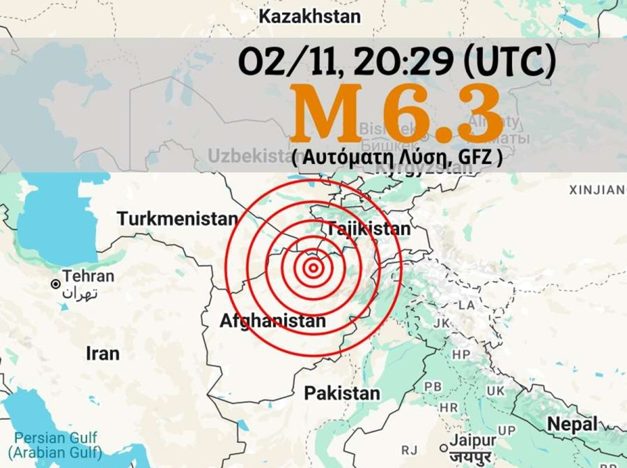 Πολύ ισχυρός σεισμός, μεγέθους 6,3 βαθμών συγκλόνισε την περιοχή Χίντου Κους του βορείου Αφγανιστάν το βράδυ της Κυριακής (02/11), όπως ανακοίνωσαν το Γερμανικό Ερευνητικό Κέντρο για τις Γεωεπιστήμες (GFZ) και το Αμερικανικό Γεωλογικό Ινστιτούτο (USGS).