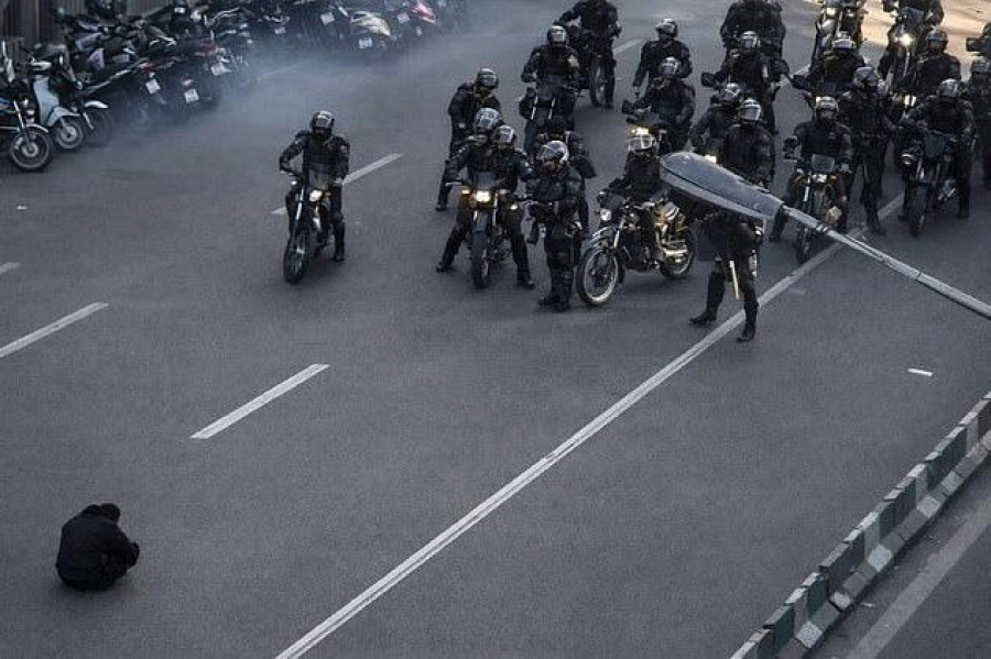 Η φωτογραφία, που κοινοποιήθηκε ευρέως από τοπικά μέσα ενημέρωσης, όπως ο τηλεοπτικός σταθμός Iran International, δείχνει έναν γενναίο διαδηλωτή να κάθεται σε δρόμο της Τεχεράνης, προσπαθώντας να εμποδίσει τους ένοπλους αστυνομικούς να περάσουν με τις μοτοσυκλέτες τους.