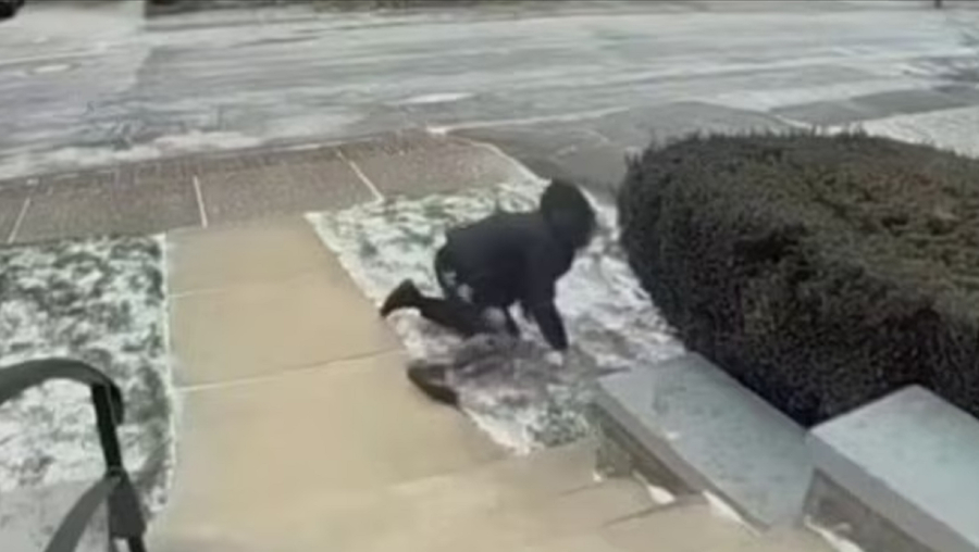 Μια γυναίκα παραλίγο να τραυματιστεί όταν ο δυνατός αέρας την «απογείωσε», την ώρα που προσπαθούσε να μπει σε σπίτι, στιγμιότυπο που κατέγραψε κάμερα ασφαλείας και έχει γίνει viral.