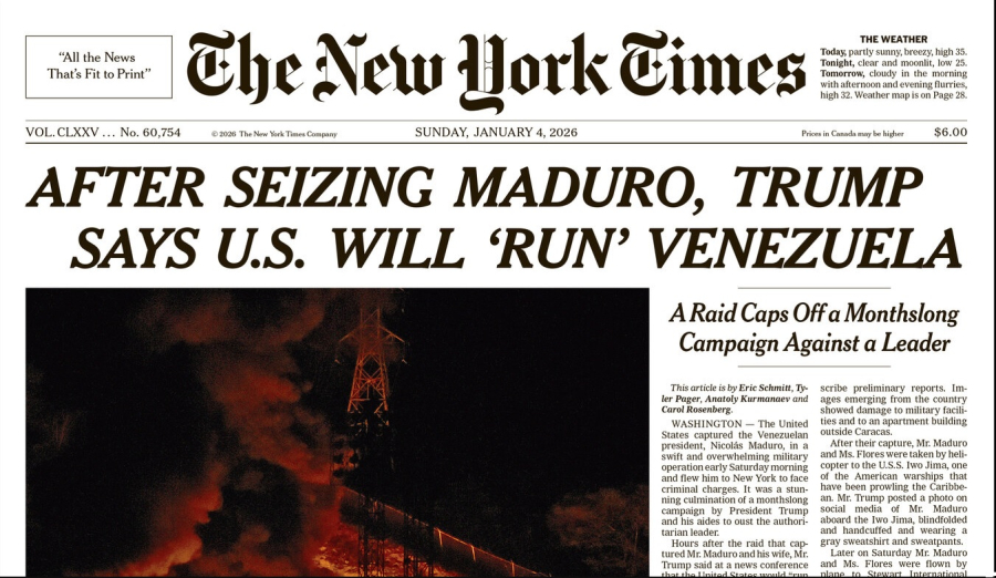 Με πυρετώδεις ρυθμούς και διαδοχικές αλλαγές μέχρι την τελευταία στιγμή καλύφθηκε από τους The New York Times η είδηση της αιφνιδιαστικής επιχείρησης των ΗΠΑ στη Βενεζουέλα και της σύλληψης του Νικολάς Μαδούρο, όπως περιγράφει η δημοσιογράφος της εφημερίδας Σάρα Μπαρ (Sarah Bahr) σε «ρεπορτάζ παρασκηνίου» για τη διαδικασία διαμόρφωσης της πρώτης σελίδας της ιστορικής εφημερίδας.