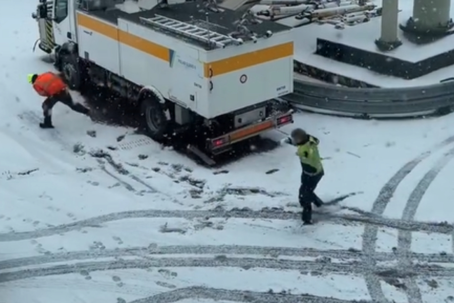 Το χιόνι μπορεί να προμηνύει προβλήματα στις αερομεταφορές αλλά μάλλον δεν έχουν την ίδια εντύπωση και οι εργαζόμενοι στα αεροδρόμια. Τουλάχιστον, όχι αυτοί οι δύο εργαζόμενοι στο αεροδρόμιο του Σίπχολ στο Άμστερνταμ.