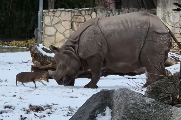 Σε βίντεο από τον ζωολογικό κήπο Βρότσλαβ στην Πολωνία, ένα μικροσκοπικό ελάφι μόλις 13 κιλών έδειξε απίστευτο θάρρος μπροστά στον ρινόκερο βάρους σχεδόν 2 τόνων.