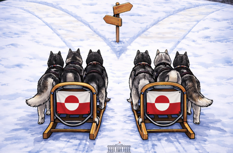 «Προς τα πού Γροιλανδέ;», είναι το ερώτημα που θέτει ο Λευκός Οίκος με το σκίτσο. Σε αυτό, η Γροιλανδία αποτυπώνεται με δύο έλκηθρα με σκύλους, σε ένα σταυροδρόμι ανάμεσα στις τρεις δυνάμεις.