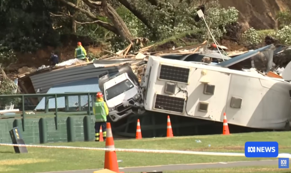 Η κατολίσθηση έπληξε τροχόσπιτα και χώρο καθαριότητας στην κατασκήνωση, στο Βόρειο Νησί, περιοχή όπου σημειώθηκαν ισχυρές βροχοπτώσεις τη νύχτα.