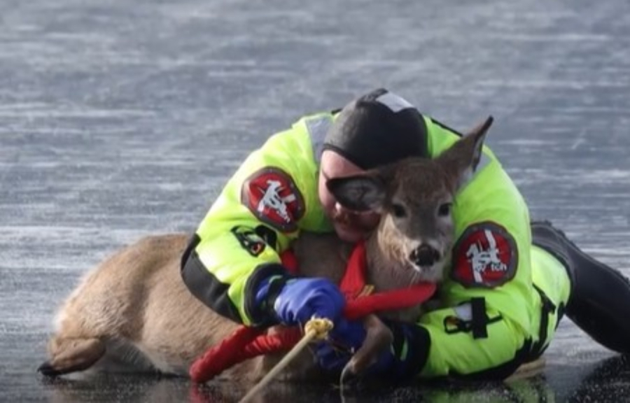 Συγκινητικό βίντεο δείχνει τη διάσωση ενός ελαφιού που εντοπίστηκε να παλεύει απεγνωσμένα στην παγωμένη επιφάνεια της λίμνης Λουν στην πολιτεία της Ουάσινγκτον.