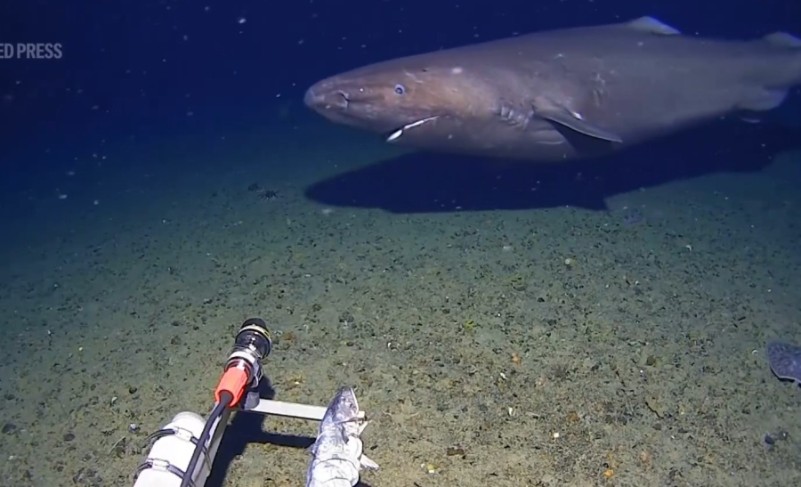 Η κάμερα που ανήκει στο θαλάσσιο κέντρο ερευνών Minderoo-UWA «έπιασε» με τον φακό της έναν καρχαρία μήκους περίπου τεσσάρων μέτρων, σε ένα βάθος ιδιαίτερα άγονο, καθώς δεν φτάνουν καν οι ακτίνες του ήλιου.