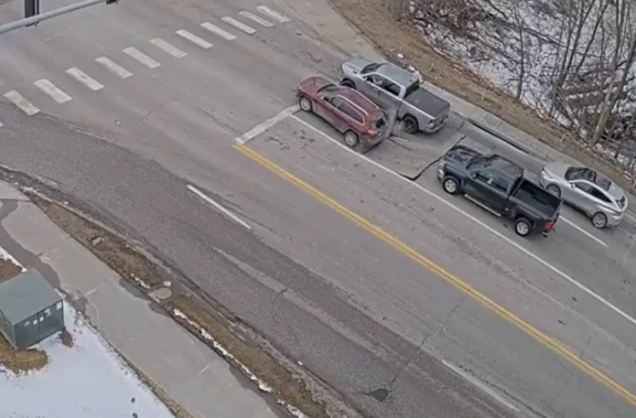 Όπως φαίνεται στο βίντεο, τα δύο αυτοκίνητα είναι σταματημένα στο φανάρι, όταν ξαφνικά ανοίγει μια τεράστια τρύπα στο οδόστρωμα και τα βυθίζει.
