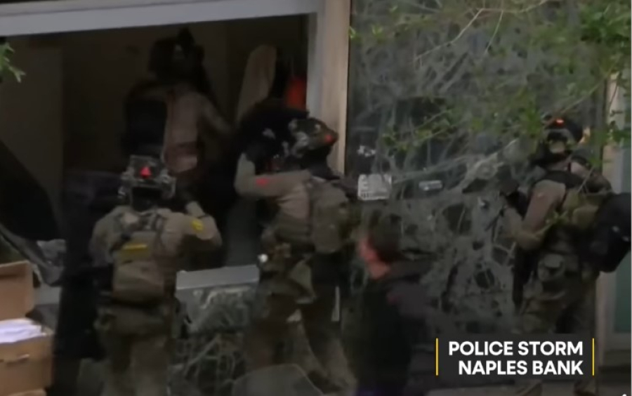 Η αστυνομία έσπασε τα παράθυρα για να μπει στην τράπεζα, όπως δείχνουν πλάνα από βίντεο τοπικών μέσων ενημέρωσης από τον τόπο του συμβάντος.