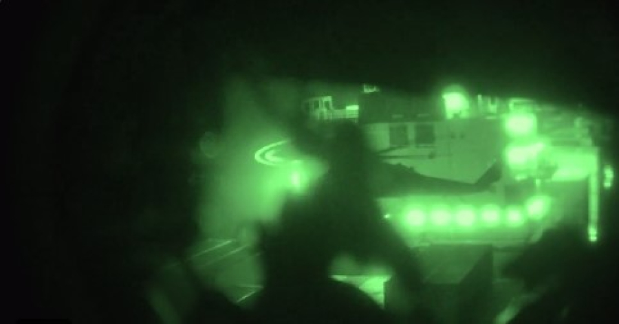 Στο νέο βίντεο εμφανίζονται οι πεζοναύτες που απογειώνονται με ελικόπτερα από το αποβατικό πλοίο USS Tripoli (LHA-7) και κινούνται πάνω από την Αραβική Θάλασσα για να επιβιβαστούν και να καταλάβουν το εμπορικό πλοίο M/V Touska.