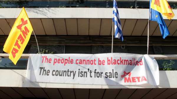 Κατάληψη του ΜΕΤΑ στα γραφεία της Κομισιόν στην Αθήνα Κατάληψη στα γραφεία της Ευρωπαϊκής Επιτροπής, στην οδό Βασιλίσσης Σοφίας, πραγματοποιούν από το πρωί μέλη του Μετώπου Ταξικής Ανατροπής (ΜΕΤΑ), τα οποία έχουν αναρτήσει δύο πανό, ένα σε μπαλκόνι και ένα στην είσοδο των γραφείων, που γράφουν στα ελληνικά και στα αγγλικά «Οι λαοί δεν εκβιάζονται, η χώρα δεν πωλείται».