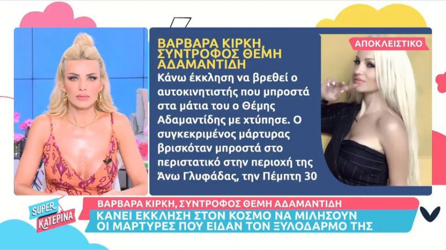 «Κάνω έκκληση να βρεθεί ο αυτοκινητιστής που μπροστά στα μάτια του ο Θέμης Αδαμαντίδης με χτύπησε. Ο συγκεκριμένος μάρτυρας βρισκόταν μπροστά στο περιστατικό στην περιοχή της Άνω Γλυφάδας, την Πέμπτη 30 Ιουνίου στις 1:30 τα ξημερώματα. Επίσης θέλω να διευκρινίσω ότι τα λεφτά που έστελνα στην πρώην σύντροφο του Θέμη, Αναστασία Στεφάνοβα, τα έστελνα κατ’ εντολή του τραγουδιστή. Δεν το έκανα αυθαίρετα. Το ίδιο συνέβαινε και στην πρώην σύζυγο του Θέμη…», τονίζει η Βαρβάρα Κίρκη.