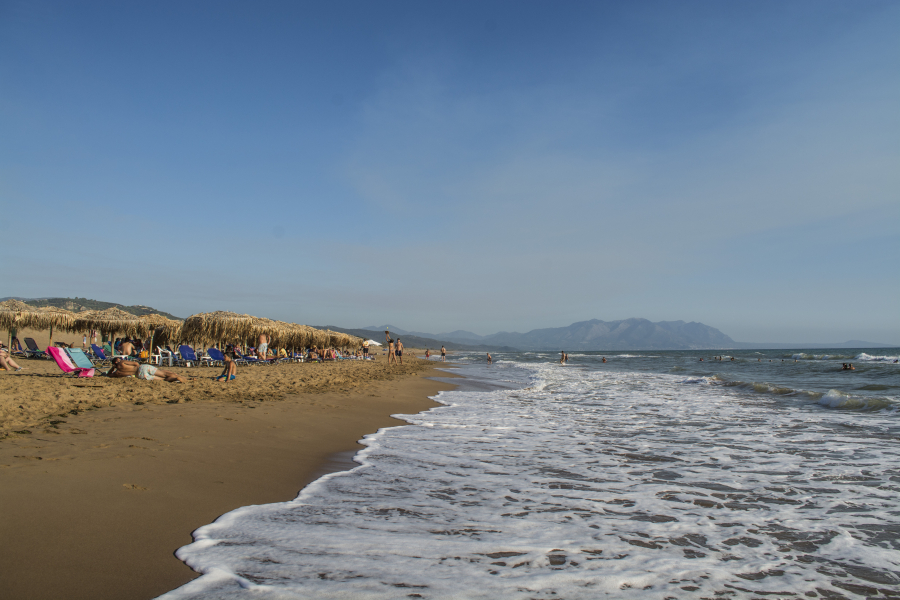 Καμπυλωτοί αμμόλοφοι φορτωμένοι λευκά κρινάκια καταλήγουν απαλά σε μια από τις ωραιότερες –και πιο απέραντες– αμμουδιές που έχεις δει ποτέ σου. Κι αυτή με τη σειρά της καταλήγει σε Ιόνια, γαλαζοπράσινα νερά χωρίς να μεσολαβεί ούτε ένα βότσαλο. Σαν να μην φτάναν’ όλα αυτά, έχεις και τον ήλιο κάθε απόγευμα να κάνει μια μεγαλοπρεπή βουτιά στην θάλασσα και να βάφει το τοπίο χρυσαφένιο.