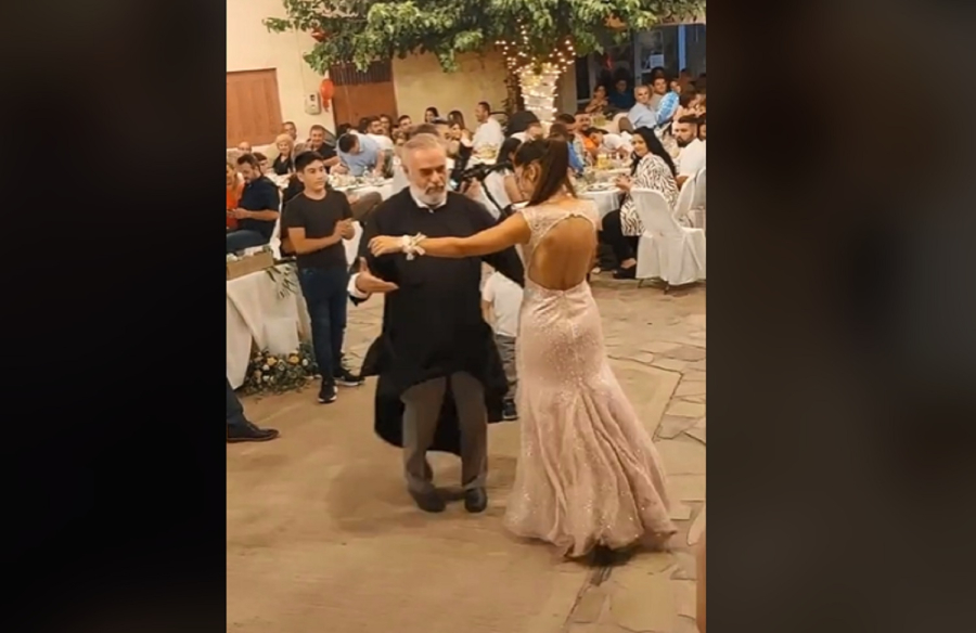 Μάλιστα, ο παπάς αποδείχθηκε μεγάλος χορευταράς αφού μετά τη σούστα με τη νύφη, χόρεψε ζεϊμπέκικο με τους συγχωριανούς να του χτυπούν παλαμάκια.