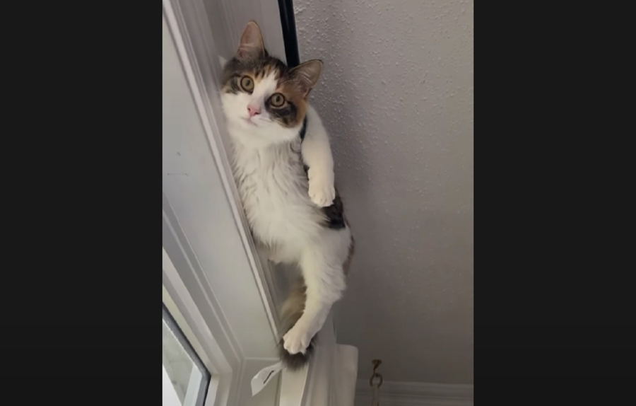 Μια γάτα που έγινε viral έχει ανέβει να... αράξει πάνω σε ένα κουρτινόξυλο και μάλιστα κρέμεται αλλά δεν φαίνεται να την πειράζει.