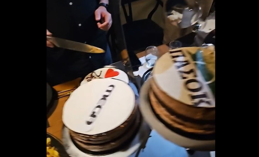 Ο καλός φίλος του ζευγαριού Δημήτρης Καπούνης ετοίμασε ένα μικρό γλέντι για το ζευγάρι, όπου πρωταγωνίστησαν τρεις τούρτες: μία για τους νεόνυμφους, μία για το Mega και μία για το... ΠΑΣΟΚ.