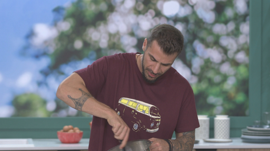 Το σαββατιάτικο μενού ξεκινάει με μια χωριάτικη ζαμπονοτυρόπιτα με λαχανικά, ένα κατεξοχήν comfort food που, ενώ ακούγεται απλό δεν είναι τόσο, αφού τα λαχανικά ανεβάζουν την θρεπτική του αξία. Την ίδια στιγμή, η παρασκευή του δεν είναι καθόλου δύσκολη. Αρχικά, ο Άκης δημιουργεί μια γέμιση, σοτάροντας σε ένα τηγάνι με ελαιόλαδο κρεμμύδι σε φέτες και ψιλοκομμένο σκόρδο. Προσθέτει πιπεριά Φλωρίνης σε κομμάτια, μανιτάρια από κονσέρβα, ζάχαρη, ρίγανη, αλάτι, πιπέρι, πελτέ ντομάτας, ντομάτα κονκασέ, τα σιγοβράζει όλα μαζί και, αφού αφαιρέσει από τη φωτιά, βάζει κασέρι τριμμένο και ανακατεύει. Σε ένα λαδωμένο ταψί βάζει χωριάτικα φύλλα , πασπαλίζοντας ενδιάμεσα με ελαιόλαδο, απλώνει τη γέμιση σε στρώσεις ενδιάμεσα από φέτες ζαμπόν, από πάνω καλύπτει με άλλα χωριάτικα φύλλα, αλείφοντας ενδιάμεσα με ελαιόλαδο, ψήνει και σερβίρει την υπέροχη αυτή πίτα.
