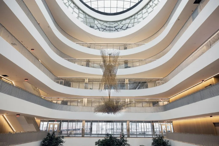 Η εγκατάσταση του αριστουργήματος, ωστόσο, δεν ήταν εύκολη υπόθεση. Τα συνεργεία κατασκευής έπρεπε να δημιουργήσουν ένα άνοιγμα πλάτους 4,5 μέτρων και ύψους 22,5 μέτρων στο πλάι του κτιρίου και στη συνέχεια να τοποθετήσουν προσεκτικά το γλυπτό σε δύο κομμάτια χρησιμοποιώντας γερανούς. Τώρα κρέμεται αρκετούς ορόφους πάνω από το έδαφος, φωτισμένο από το ηλιακό φως που εισχωρεί μέσα από την γυάλινη οροφή.