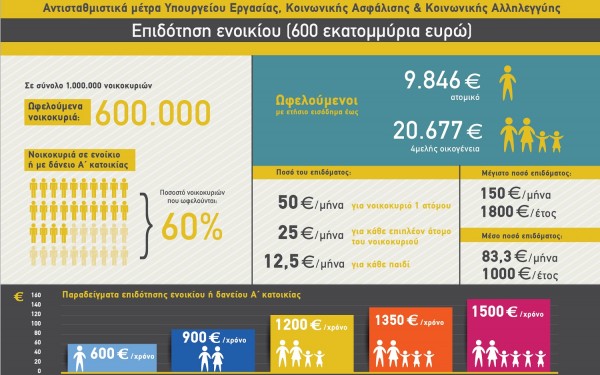 *Επιδότηση ενοικίου: Κοστολογείται στα 600 εκατ. ευρώ και εκτιμάται ότι επί συνόλου 1.000.000, θα προκύψουν 600.000 ωφελούμενα νοικοκυριά. Ουσιαστικά ωφελούνται το 60% των νοικοκυριών που βρίσκονται σε ενοίκιο ή που έχουν πάρει δάνειο για α’ κατοικία. Το εισοδηματικό όριο που τίθεται είναι τα 9.846 ευρώ ατομικό και 20.677 για τετραμελή οικογένεια. Το ποσό του επιδόματος κυμαίνεται από 50 ευρώ το μήνα για νοικοκυριά με ένα άτομο και αυξάνεται κατά 25 ευρώ το μήνα για κάθε επιπλέον άτομο του νοικοκυριού και 12,5 ευρώ το μήνα για κάθε παιδί. Το μέγιστο ποσό του επιδόματος που θα χορηγείται ανέρχεται στα 150 ευρώ το μήνα ή 1.800 ευρώ το έτος και το μέσο ποσό είναι αντίστοιχα τα 83,3 ευρώ το μήνα και τα 1.000 ευρώ το έτος. Σύμφωνα με τα παραδείγματα που δημοσιεύει το υπουργείο Εργασίας η επιδότηση ενοικίου για ένα άτομο είναι 600 ευρώ το χρόνο, για δύο άτομα 900 ευρώ το χρόνο, για τετραμελή οικογένεια με δύο μικρά παιδιά, 1.200 ευρώ, για πενταμελή οικογένεια με τρία μικρά παιδιά 1.350 ευρώ και για εξαμελή οικογένεια με τέσσερα μικρά παιδιά 1.500 ευρώ.