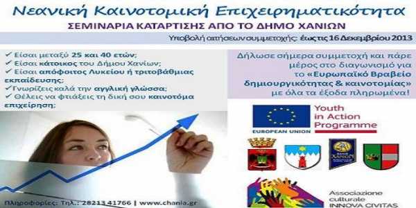 Το πρόγραμμα του δήμου Χανίων αφορά όσους νέους θέλουν να φτιάξουν την δική τους καιινοτόμα επιχείρηση και καλεί τους ενδιαφερόμενους να κάνουν αίτηση συμμετοχής στο νέο πρόγραμμα κατάρτισης για τη «Νεανική Καινοτομική Επιχειρηματικότητα» που θα υλοποιήσει ο Δήμος Χανίων , από τις 17-21 Δεκεμβρίου 2013, στο πλαίσιο του ευρωπαϊκού προγράμματος “Νεολαία σε δράση - Youth In Action” στο οποίο συμμετέχει ως εταίρος.