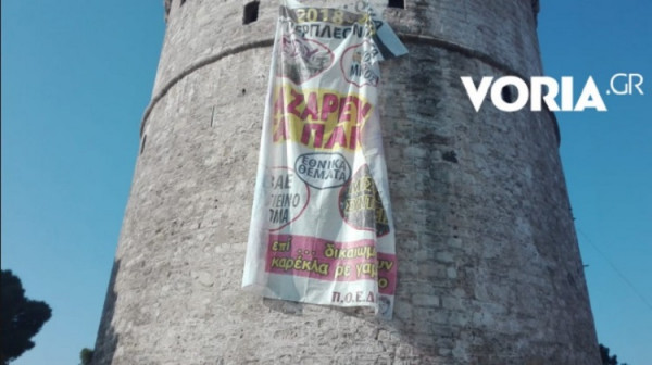 Μάλιστα, όταν εργαζόμενοι στον Λευκό Πύργο έκοψαν τα σχοινιά του πανό, οι διαδηλωτές απάντησαν: «Την προηγούμενη εβδομάδα χειροκροτούσατε όταν αναρτήθηκε το πανό του ΣΥΡΙΖΑ. Το δικό μας, μας το κόβετε».