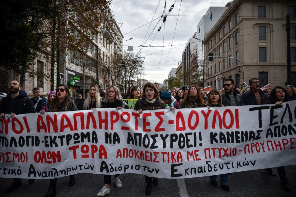 Με κεντρικό σύνθημα «μαζικοί διορισμοί εκπαιδευτικών, όχι στην παιδεία των περικοπών», οι εκπαιδευτικοί συγκεντρώθηκαν νωρίτερα στα Προπύλαια και πρόκειται να κατευθυνθούν με πορεία στη Βουλή. Παράλληλα στο Σύνταγμα ήδη βρίσκονται εκπαιδευτικοί της ΔΟΕ και της ΟΛΜΕ.