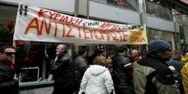 Με κεντρικό σύνθημα «Ποτέ την Κυριακή» μέλη της Ομοσπονδίας Ιδιωτικών Υπαλλήλων Ελλάδος (ΟΙΥΕ) μαζί με απολυμένες καθαρίστριες πραγματοποίησαν σήμερα λίγο μετά τις 11 το πρωί συγκέντρωση διαμαρτυρίας στο εμπορικό κέντρο «The Mall Athens» στο Μαρούσι, εκφράζοντας την αντίθεση τους στην κυριακάτικη λειτουργία των καταστημάτων.
