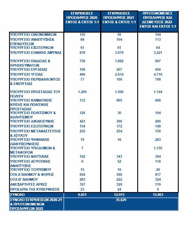 - Προσλήψεις: Τον Σεπτέμβρη του 2022 προγραμματίζεται να γίνει ο διαγωνισμός του ΑΣΕΠ για μόνιμους διορισμούς στο Δημόσιο. Οι διορισμοί, που έχουν προγραμματιστεί, για το 2021 ανέρχονται σε 12.915 και για το 2022 σε 15.863.