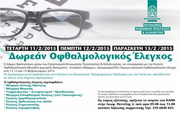 Δωρεάν Οφθαλμολογικός Έλεγχος στο Δήμο Βριλησσίων Ο Δήμος Βριλησσίων, μέσω του Οργανισμού Κοινωνικής Προστασίας & Αλληλεγγύης, σε συνεργασία με την Κινητή Οφθαλμολογική Μονάδα χορηγίας Ιδρύματος «Σταύρος Νιάρχος»,