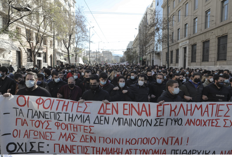 Φοιτητές και εκπαιδευτικοί που στηρίζουν την κινητοποίηση αντιδρούν στην πανεπιστημιακή αστυνομία, στις αλλαγές στον τρόπο εισαγωγής στην Τριτοβάθμια Εκπαίδευση και σε σειρά άλλων θεμάτων.