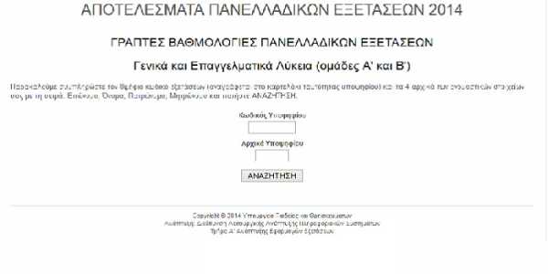 Στην ειδική ιστοσελίδα results.it.minedu.gov.gr του υπουργείου Παιδείας αναρτήθηκαν των Πανελληνίων 2014. Οι μαθητές μπορούν απο τον υπολογιστή τους να δουν τους βαθμούς τους και να έχουν μια εικόνα σε ποια σχολή ΑΕΙ ή ΤΕΙ θα περάσουν.