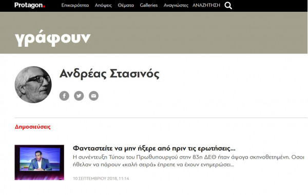 Ενας από αυτούς είναι και κάποιος Ανδρέας Στασινός. Αγνώστων λοιπών στοιχείων. Σε σημερινό του άρθρο για την συνέντευξη Τύπου του πρωθυπουργού στην ΔΕΘ σχολιάζει τα Μέσα στα οποία δόθηκαν ερωτήσεις από τον κυβερνητικό εκπρόσωπο. Και μεταξύ άλλων αναφέρεται υποτιμητικά για τα dikaiologitika.gr που είχαν φυσικά απεσταλμένο στην Θεσσαλονίκη και υπέβαλε ερώτηση στον Αλέξη Τσίπρα.