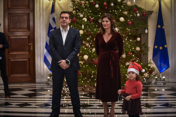 Λίγο μετά τις 11, απέναντι από το χριστουγεννιάτικο δέντρο του Μεγάρου Μαξίμου, απέναντι από τον πρωθυπουργό και τη σύντροφό του, πήραν τη θέση τους τα παιδιά του Δημοτικού σχολείου Διαπολιτισμικής Εκπαίδευσης Αλσούπολης.