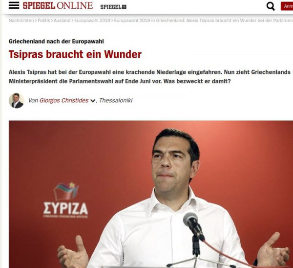 Ο Αλέξης Τσίπρας υπέστη ηχηρή ήττα στις ευρωεκλογές και προανήγγειλε πρόωρη προσφυγή στις κάλπες. Σε τι αποσκοπεί; διερωτάται το Spiegel Online με τίτλο «Ο Τσίπρας χρειάζεται ένα θαύμα».