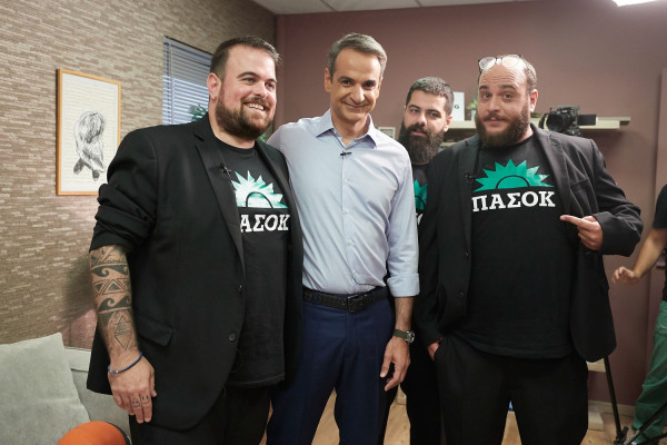 Ο πρόεδρος της ΝΔ, Κυριάκος Μητσοτάκης χθες δεν... κώλωσε να πάρει μέρος σε μια διαφορετική συνέντευξη από τις «Μύγες», τον Θανάση Πασσά, τον Φάνη Λαμπρόπουλο και τον Νίκο Ράπτη, που τον υποδέχθηκαν φορώντας μπλουζάκια με τον ήλιο τον πράσινο, κρατώντας σημαιάκια του ΠΑΣΟΚ και ενώ έπαιζε Κάρμινα Μπουράνα.
