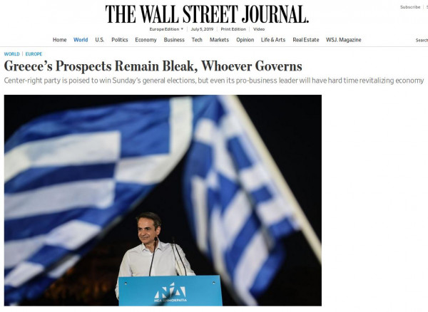 «Οι Έλληνες αναμένεται να εκλέξουν μια φιλική προς τις επιχειρήσεις κυβέρνηση την Κυριακή, αλλά οι προοπτικές για την οικονομία της χώρας παραμένουν δυσοίωνες. Αφού βίωσε τη χειρότερη ύφεση ανεπτυγμένης χώρας από τη δεκαετία του 1930 η ελληνική οικονομία παραμένει συρρικνωμένη κατά 24% σε σχέση με το 2007, πριν την έναρξη της οικονομικής κρίσης. Οι πιστωτές της Ελλάδας, υπό τη Γερμανία, συνεχίζουν να επιμένουν σε μεγάλα πρωτογενή πλεονάσματα για την εξυπηρέτηση των δανείων διάσωσης των τελευταίων χρόνων. Οι σκληροί στόχοι των πιστωτών έχουν φορτώσει την Ελλάδα με ασφυκτικά υψηλούς φόρους που αποθαρρύνουν την επιχειρηματική δραστηριότητα και συνεισφέρουν στην μετανάστευση ειδικά νέων και μορφωμένων ανθρώπων»,γράφει η WSJ.