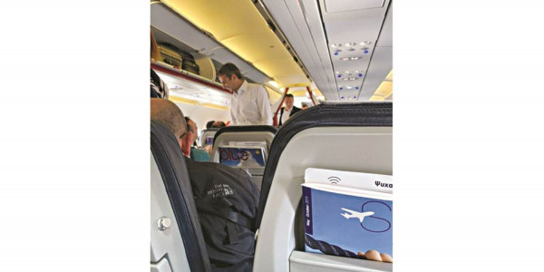 Φωτογραφίες, οι οποίες διέρρευσαν από επιβάτες της ίδιας πτήσης, δείχνοντας τον Κυριάκο Μητσοτάκη στο αεροσκάφος να είναι ευδιάθετος και χαμογελαστός.