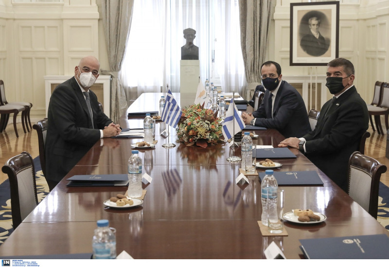 Λίγα λεπτά πριν από τις 12:00 οδηγήθηκαν στην αίθουσα «Ιωάννης Καποδίστριας», όπου είναι σε εξέλιξη η κατ' ιδίαν τριμερής συνάντηση των υπουργών Εξωτερικών και στη συνέχεια θα ακολουθήσει διευρυμένη συνάντηση με τις αντιπροσωπείες της Ελλάδας, της Κύπρου και του Ισραήλ.