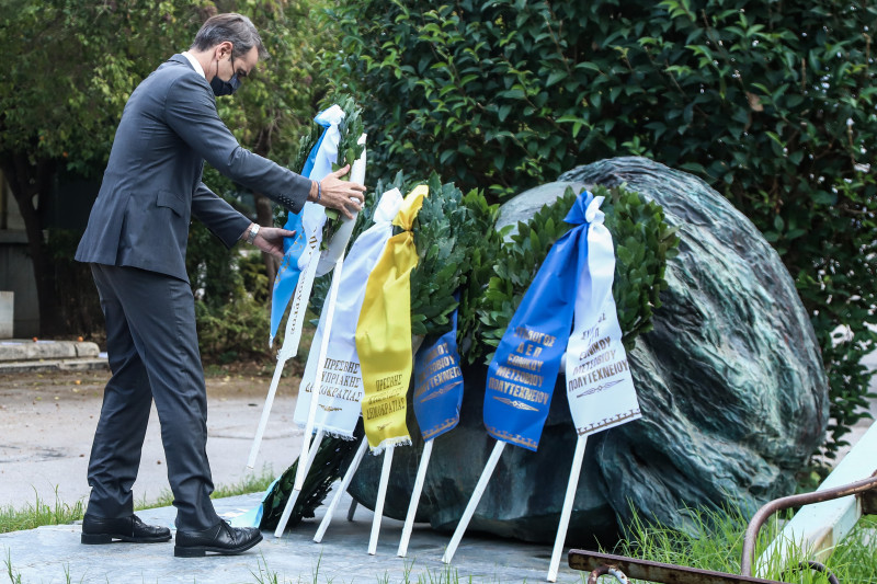 Σε συνθήκες πολύ διαφορετικές από ό,τι τις προηγούμενες χρονιές, ο πρωθυπουργός βρέθηκε στο χώρο του Πολυτεχνείου μόνος, κατέθεσε στεφάνι και στη συνέχεια προχώρησε σε μια σύντομη δήλωση στους δημοσιογράφους.