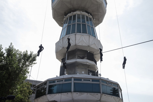 Συγκεκριμένα, άνδρες της ΕΚΑΜ (Ειδική Κατασταλτική Αντιτρομοκρατική Μονάδα) ετοίμασαν μια εντυπωσιακή επίδειξη, όπου δύο εξ αυτών, με τη βοήθεια ειδικού εξοπλισμού κατέβηκαν από τον πύργο του ΟΤΕ.