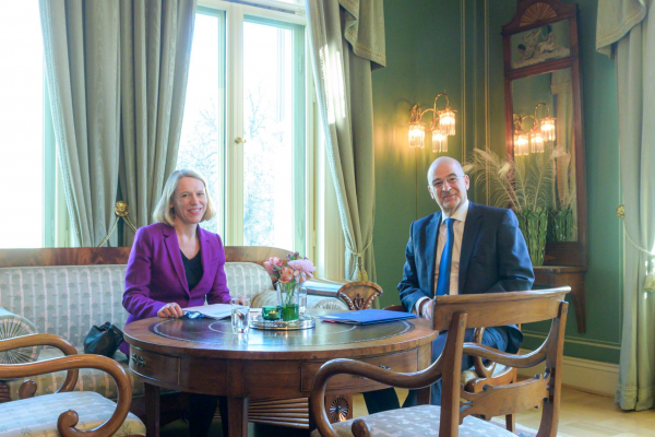 Ο Νίκος Δένδιας, συνοδευόμενος από τον υφυπουργό Εξωτερικών Κώστα Φραγκογιάννη, έτυχε θερμής υποδοχής από την υπουργό Εξωτερικών της Νορβηγίας. Όπως επίσης έγινε γνωστό σε ανάρτηση του υπουργείου Εξωτερικών, κατά τη συνάντησή τους, συζητήθηκαν η προώθηση των σχέσεων Ελλάδας-Νορβηγίας σε τομείς κοινού ενδιαφέροντος, συμπεριλαμβανομένων των επενδύσεων, της ναυτιλίας και της πράσινης ενέργειας, καθώς και η συνεργασία σε διεθνείς οργανισμούς και το Δίκαιο της Θάλασσας. Στο επίκεντρο της συνάντησης βρέθηκαν οι εξελίξεις σε Ανατολική Ευρώπη και Ανατολική Μεσόγειο.