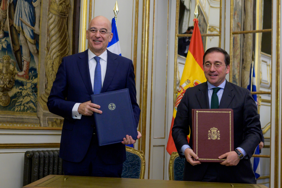 Με την υπογραφή δύο μνημονίων κατανόησης για πολιτικές διαβουλεύσεις και για τη συνεργασία στον τομέα της διπλωματικής εκπαίδευσης, ολοκληρώθηκε η συνάντηση του υπουργού Εξωτερικών Νίκου Δένδια με τον Ισπανό ομόλογό του, Χοσέ Μανουέλ Αλμπάρες (José Manuel Albares), στη Μαδρίτη.