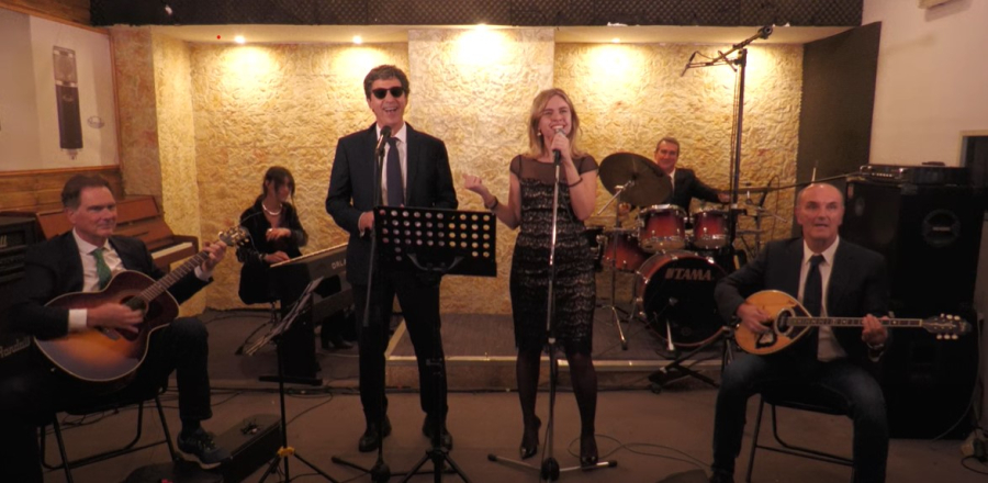 Στο μπουζούκι είναι ο γιατρός - ακτινολόγος Χρήστος Παπαθανασόπουλος και στα πλήκτρα η Τατιάνα Δουβαρά.