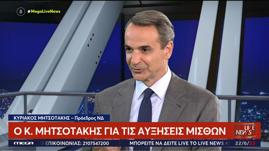 "Η αύξηση των μισθών αποτελεί τον κεντρικό πολιτικό στόχο και το προσωπικό μέτρο για να κρίνω την επιτυχία μίας δεύτερης θητείας εφόσον μας αεμπιστευτούν οι Έλληνες πολίτες" , δήλωσε ο Πρόεδρος της ΝΔ, Κυριάκος Μητσοτάκης σε τηλεοπτική συνέντευξη που παραχώρησε στο Mega.